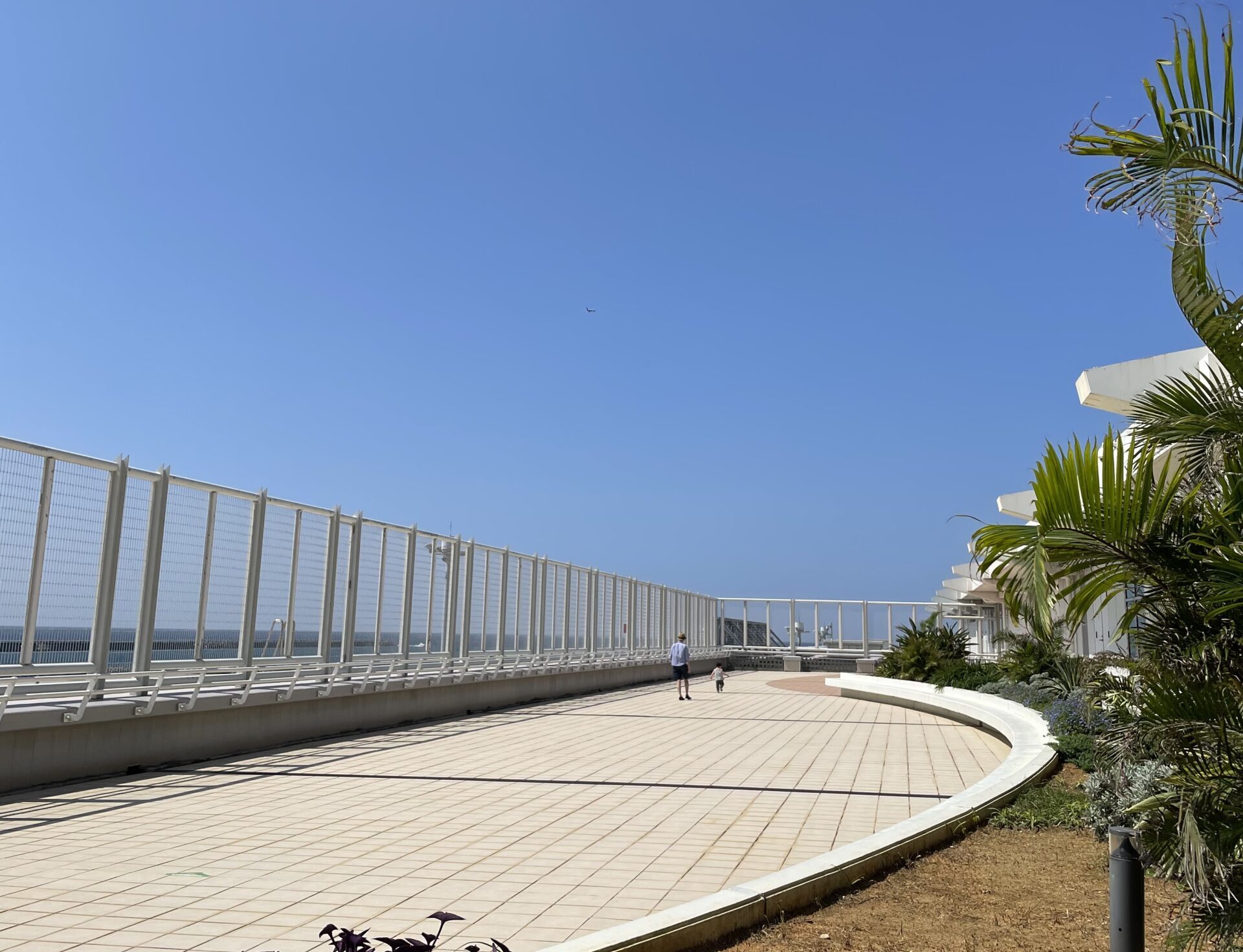 外の空気を吸うのも兼ねて、展望デッキに向かったら、けっこう遠く、さらにデッキは暑いし、ベンチもありませんでした。